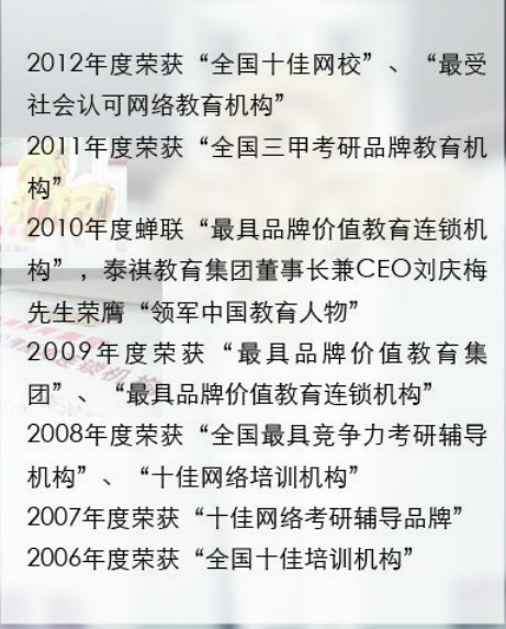 泰祺教育集团在业界享有极高的知名度和美誉度,是中国MBA、MPA、MPAcc、审计硕士、MEM(工程管理硕士)、MTA(旅游管理硕士)、GCT等专业学位研究生考前辅导领域的领先品牌,占有中国专业学位考前辅导领域市场份额。目前除面授教学外,还在全国开展远程网络培训,学员覆盖全国近30个省市自治区,满足了不同地区学员的培训需求。在考生中赢得了广泛的美誉度和极高的信任感,各院校所推崇的考前辅导权威机构,成为广大考生考前辅导的品牌。多次获奖:泰祺教育集团荣获新浪2010中国教育盛典"2010年度具有品牌价值教育集团";泰祺教育集团荣获新浪2011教育盛典"具有影响力教育连锁机构" 点击查看